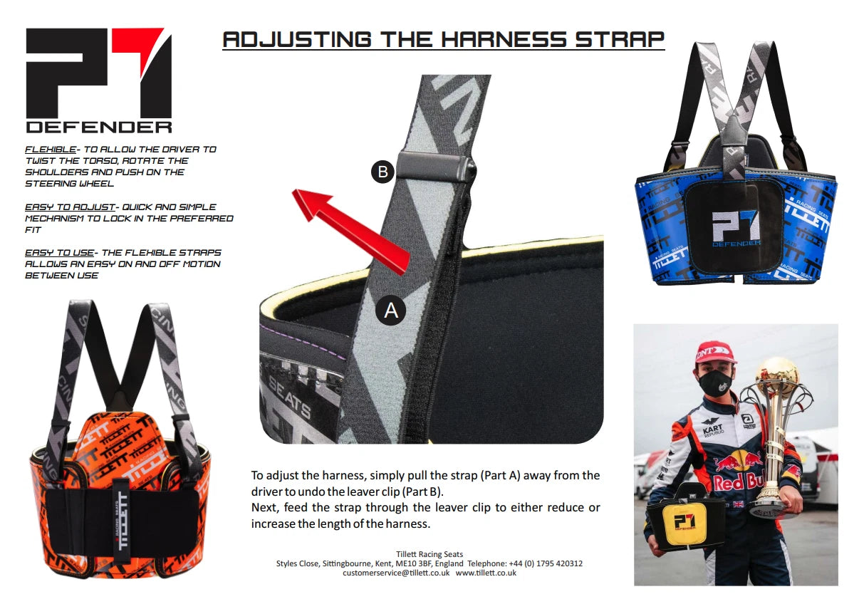 Fully adjustable to the angle of the driver’s chest shape. Adjustable and elasticated shoulder harness straps to accommodate body length.